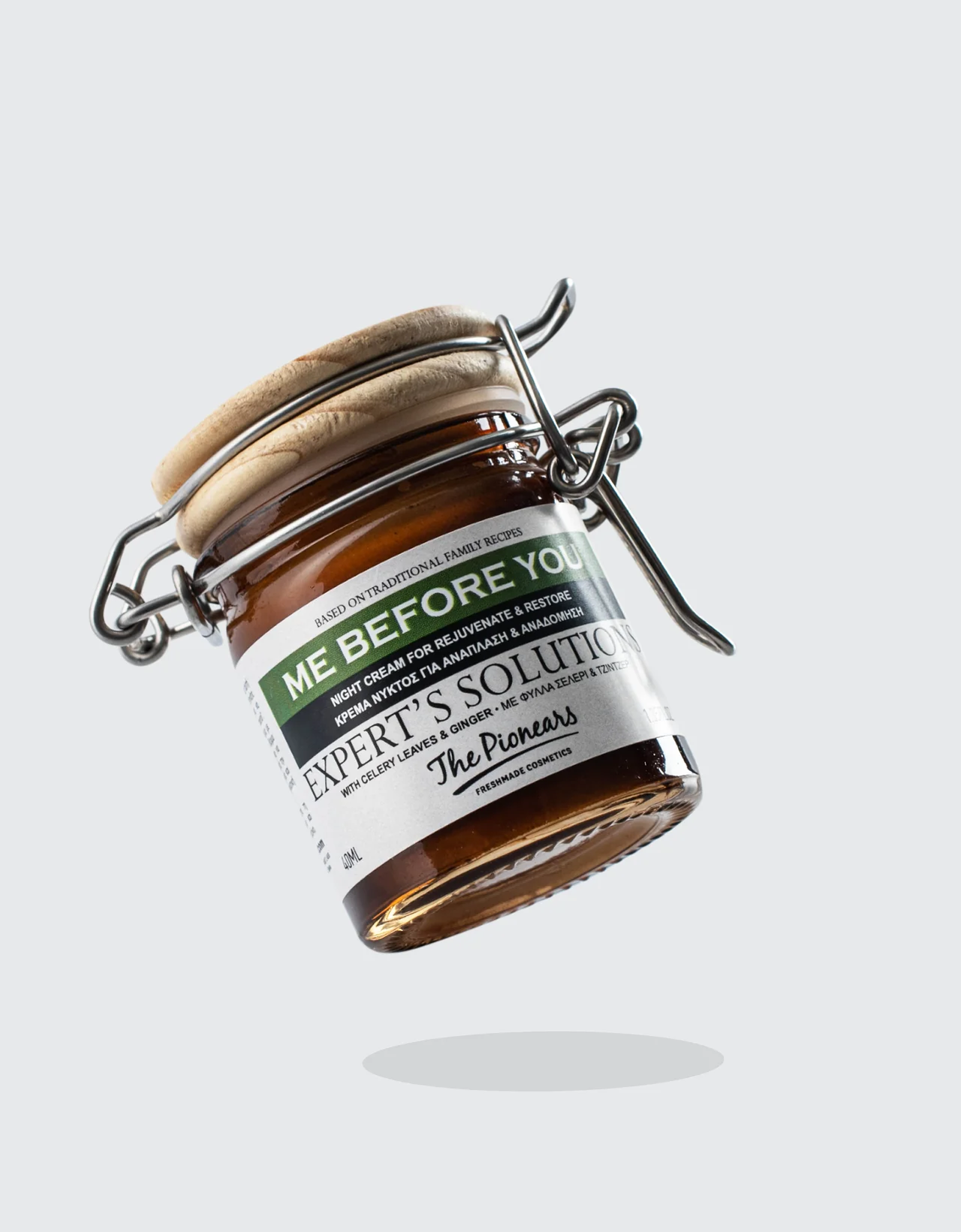 Μετά από τη “γνωριμία” σας με αυτή τη κρέμα νυκτός, θα ξυπνάτε τρέχοντας στο καθρέφτη για να χαμογελάσετε στο νέο σας “εαυτό”. Άμεσα δραστική πλούσια κρέμα με φύλλα σέλερι που δίνουν στο δέρμα την τροφή που χρειάζεται για να αναπληρώσει τα χαμένα – κατά την διάρκεια της ημέρας – στοιχεία και τζίντζερ για να επαναφέρει τη φυσική λάμψη και υγεία της!