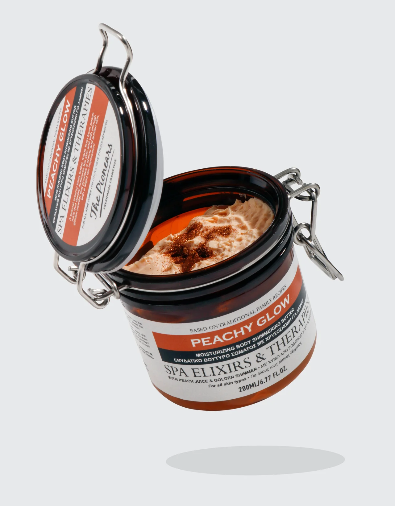 Ένα ιδιαίτερο βούτυρο σώματος παρασκευασμένο με χυμό από φρέσκα ροδάκινα που ενυδατώνουν σε βάθος την επιδερμίδα και μια αρκετή δόση χρυσόσκονης για να χαρίσει μία λαμπερή και χρυσαφένια επιδερμίδα, δίνοντας τη ψευδαίσθηση ενός ελαφρού μαυρίσματος!